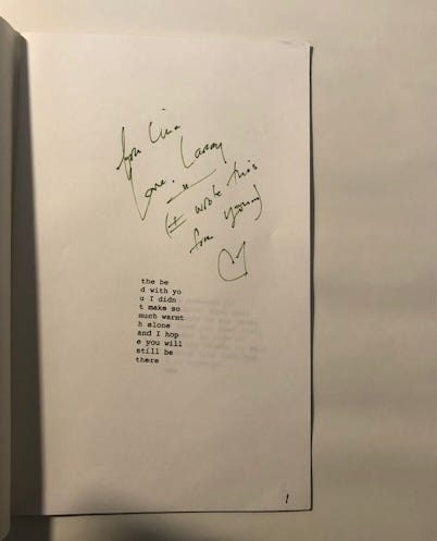 But “real” (← in quotes) because I also find comfort in metaphysical territories, so I gravitate toward the notion that “reality” and dream are interchangeable, inextricable even. This always leads me to try and connect with L, on either plane—it does not matter which. Like a tv or radio channel, I flip between found notes formerly tucked away in books, his poems (I’ve been reading them nightly for the last year), animal totem cards, tarot and astro readings, lucid dreams, and random playlists that “prophetically” soundtrack my loss and sorrow (yes, I know, it’s not so much prophetic as it is my algorithm). And I have noticed lately that when I “ask” him for a signal or sign, I don’t always receive as easily as I did in the immediate aftermath of his death.